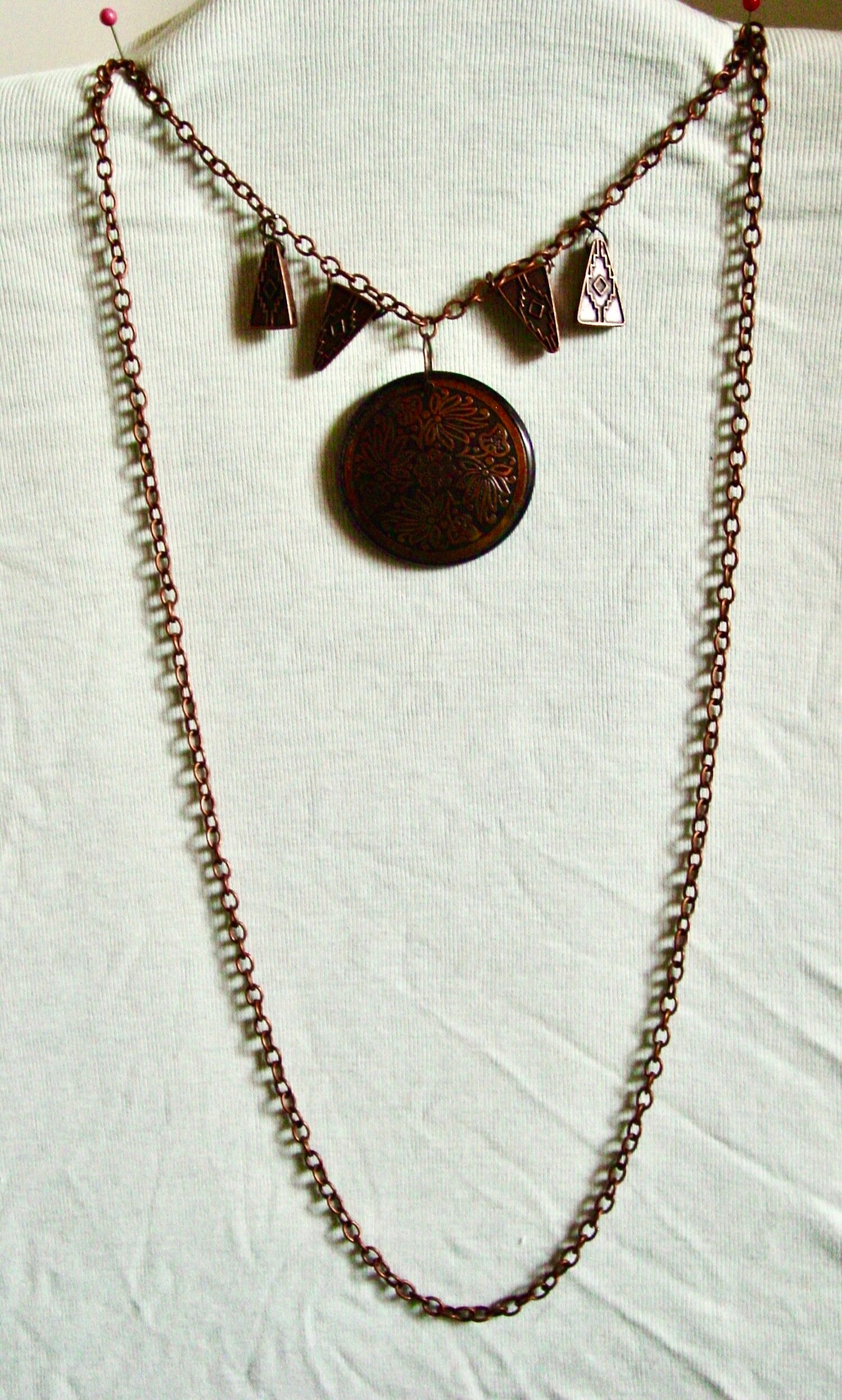 Copper medalion & charms on 20" copper chain - approximately 20" long.
